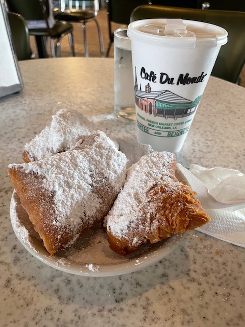 I walked through the French Market two blocks down six over to Cafe Du Monde, sat at a table with all the other tourists, and had coffee and a set of beignets drowned in powdered sugar. While I felt I was just another tourist, the beignets and coffee (dangerously hot) were excellent. I can see why beignets are so famous- they are excellent. I did not sing the song, but I thought about it.