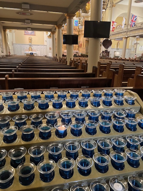 I found a credit card slot beside the candles, used it to pay $6 for a candle, and lit it for Susie. I did cry then; grief finds you when you notice that someone is missing. I was alone in the church, remembering.