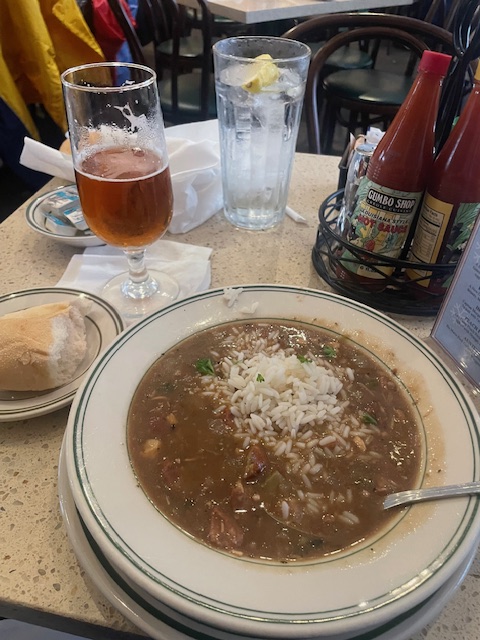 The cabbie suggested Red Fish for lunch, but my app said it opened at 3PM, nope. I wandered for a while and found myself again at the Vampires, but then discovered that the Gumbo Shop was nearby. I found a seat at the shop; it was muggy and sprinkling. I sat inside. I cannot (sorry, Dale) recommend the chicken-based gumbo, and the gal beside me agreed that their food was not great today. She was there for the food and was disappointed. She also said she is heading to Portland tonight, so I suggest Olympic Provisions if she can fit it in.
