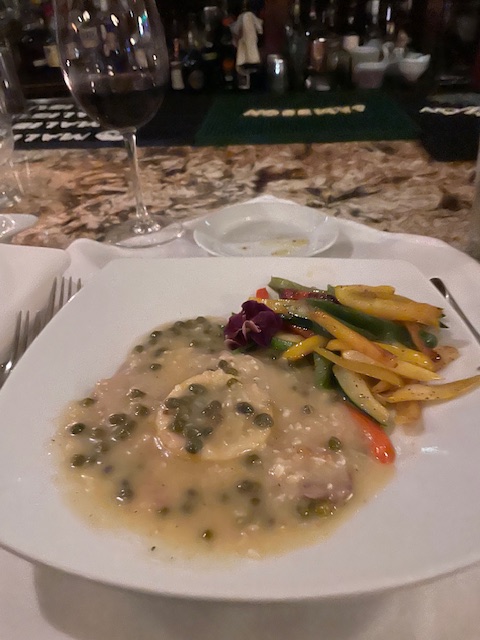 The flavor was good and not too salty–a fear after being in Texas, the land of the proud salty people. The wine, veggies, and veal all matched. Susie requires veal to be pounded until you cut it with a fork. This was close, with only a few bits that needed my knife. I loved it. But it is not New Orleans flavors, and I have had just as good at various places. It is an excellent meal, but at a very high table price–beware. I had dessert: gelato filled with chocolate sauce. It and coffee were perfect.