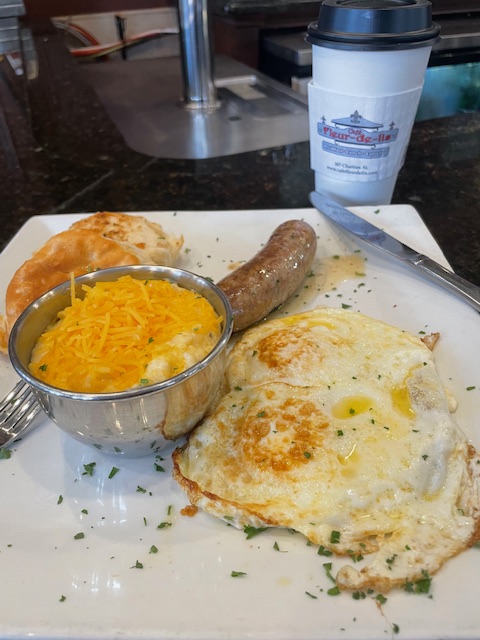 I found a place at the counter (or bar) and waited for my breakfast for a long time. Finally, a simple cajun sausage and cheezy grits joined my two fried eggs. I ate slowly as I was feeling off. My colon required some attention in the morning, and I had to prove hydration a surprising number of times last night. While not hungover, I felt that way after breakfast.