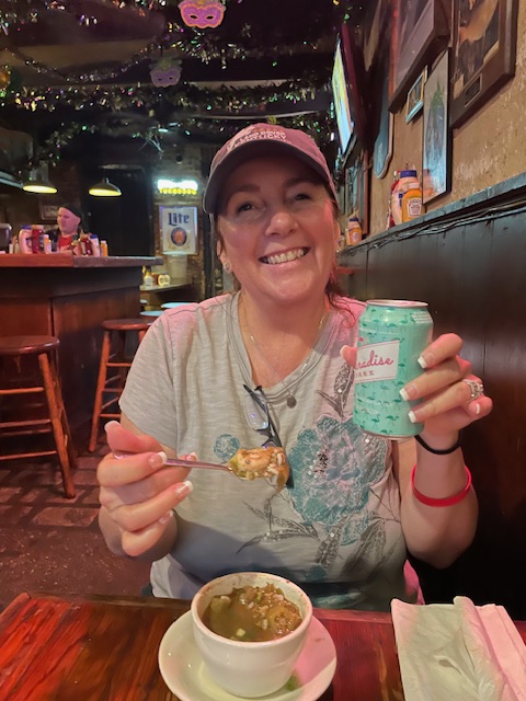 I returned to the Faubourg Marigny and found Jesse and Linda at Bamboula’s, which had food and music. Ms. Sigrid & The Zig Zags were still playing. I had heard them earlier while wandering the area but did not want another drink. These places are No Cover, but you must, at least, buy a drink a set. Linda and Jesse split a burger. I shared a giant pretzel and hot crab dip. The band was good.
