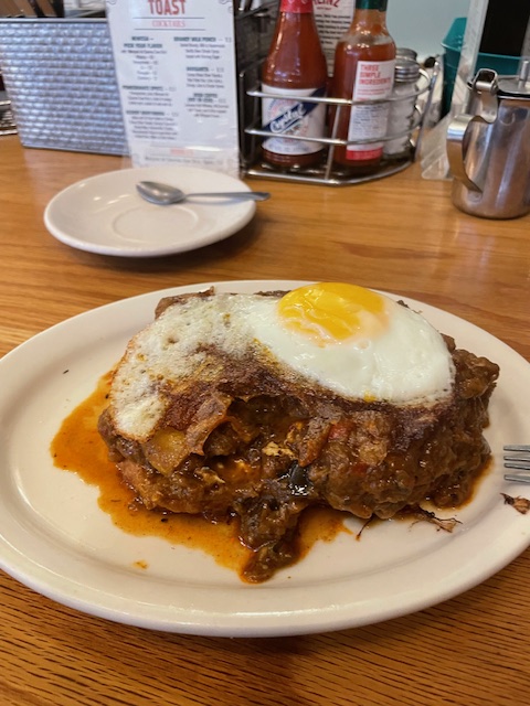 Moving back to almost the start of the day, it was wet, and thunder was still heard often. I walked to Toast (I called it French Toast before, but I think it is just “Toast”) and tried the ratatouille on toast with a fried egg. It was not presented well, but it was still good. I sat at the counter and listened to the folks. The waiters were excited as one of them had an invitation to dance in a Madri Gras parade. The breakfast crowd was younger and less hangover than the older folks from earlier this week. It is Friday, and it looks like the crowd has changed.
