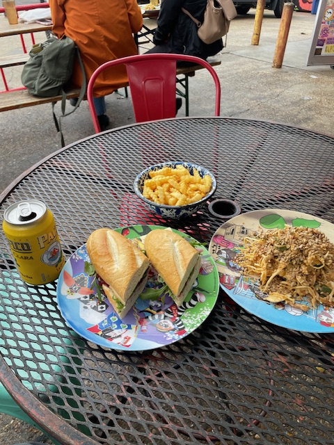 I got off at stop 11, while 12 was recommended. I walked three blocks to a place that looked like it served excellent Southern food. “Sorry, we are closed” was not the response I expected. But I was directed to their other place and warned it was a walk. I headed back the way I came, no surprise there, and soon was in the Irish Channel, I think, and found a huge line to a tiny place after walking ten blocks, Turkey and the Wolf. Apparently, it’s a famous place and known to foodie who filled the line. It took nearly an hour to get my food: an excellent ham sandwich, a side of cabbage salad, and fries. All was good, and I ordered extra.