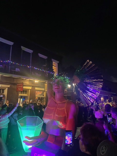 I walked back, only going the wrong way once, through loud and drunken Bourbon Street. The crowd was full of Krewe members who were in the parade, and lots of young people dressed in tight outfits were holding, drinking, and running to the next club. This is the weekend crowd.