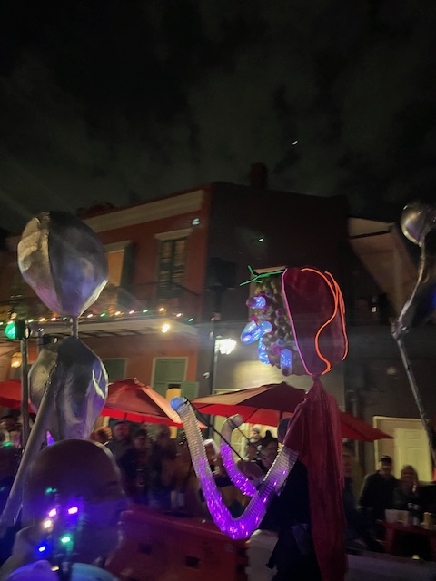 We rested at Le Richelieu until about 7:15 as the Mardi Gras parade tonight started in Marigny at 7. We found the crowds at Royal Street, and the parade arrived at about 7:45, going very slowly. This was the smaller local parade dedicated to the Green Fairy, absinthe. The small floats were about drinking the green liquor and the side effects of the same. Linda managed to snag a few small throws. I was happy to enjoy the parade. I did feel underdressed in my hat and sweater. Most folks were in shiny apparel, often with very little coverage.
