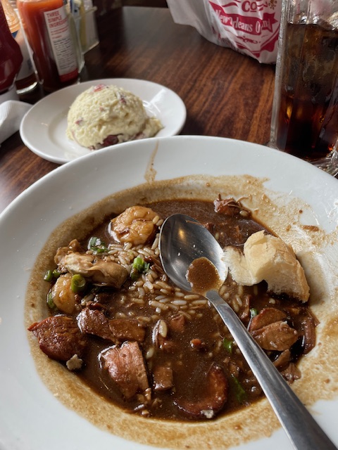 I headed to Stanley’s even when I was not that hungry. I was told their gumbo was the best. I got a table after noon passed, the bells sounding wonderful, and I tried it. It was delicious, but no okra, and as good as Coop’s Place. One of the locals was there and said they liked the food. The waiter said it was as good as what you can get in the tourist area, the French Quarter, but it was not spicy and salty like good gumbo. The waiter and I talked about cooking, and she told me how to make gumbo. Start with the trinity (one part white onion, one part green bell pepper, and one part celery), add the meats, and let that good a long while. Add your veggies and spices, authentic version from people who know, and add your seafood (she was not sure oysters should be included, but she knows some folks like it) and then a bit of Old Bay (East Coast) or Crab Boil (Gulf Coast and her choice, but acknowledged it was an item of dispute). We talked about cooking while I enjoyed their just OK food (I liked it).