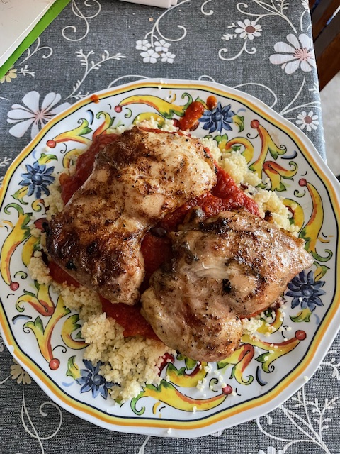 I heated a jar of couscous sauce made in the North African style. It does not have the Italian-style flavor of garlic and onions cooked long, but olives and lemons added to a fresh tomato base. I bought this at Elephants Delicatessen–a favorite. I made couscous to go with it (seems to fit). I heat some spices, almond slices, and cranberries in butter. I then toast the couscous in the pan. I add water (it is very hot) and let that settle with no heat. I grilled the chicken on the grill, using indirect heat to cook it and then letting the flames finish it. Excellent.