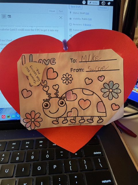 I spent the whole day doing this with my group and helped when I could. We got lunch supplied, and I had a 6″ Subway tuna fish sub. This even exists in my app, and I added the food to my daily list. We took a break. I started walking a circle of sidewalks near the Nike WHQ Swift building (yes, we are beginning to adopt the name “Swifties”) and did five fast circles for over 2,500 steps. I returned to the meetings after that. I was light-headed as I suspected my calorie count and diabetes meds left me with low blood sugar. I got more water and a bag of peanut butter-filled pretzels (not recommended, but it had peanut butter)–140 calories (and I could scan the UPC to get it into my food list).