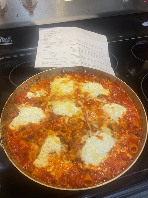 I cooked a new recipe from The New York Times, Cheesy baked pasta and sausage. I used hot and spicy Italian-style sausage and reduced the salt a bit, but other than that, I followed the recipe. I made mock Ricotta cheese as I forgot to get it (mix sour cream and cottage cheese). Corwin said it was good, and this finished ruining my calorie count, especially the second bowl. Excellent.