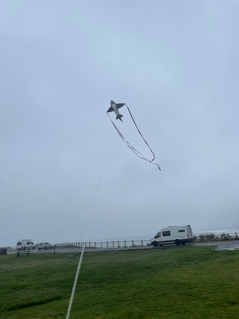 I suggested we fly a kite, and Kathleen got in Air Volvo First Class, and we headed north to Boiler Bay. The winds and the rain were more now, and Kathleen could get the kite to the end of its string with only a few close calls. The shark’s kite tail seemed to swim in the sky, and a few birds looked like they were being chased by our sky shark.