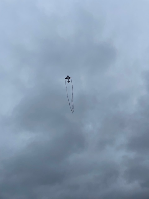 The kite store was open across from the beach, so I skipped over Highway 101 in Air Volvo. I bought a kite in the shape of a shark, nylon to survive the wet and salt, and inexpensive. I was tempted by a pirate sailing ship, but it required assembly, and I wondered how well it flew. So I went with simple, and I had a shark kite before. I also spotted an elegant red, white, and blue banner I bought. I had to ring the bell three times to get the shopkeeper to appear. She showed with a green pepper and a knife in her hands. I suggested she could finish what she started, but she put down the vegetable and knife and sold me the stuff. She thanked me for the business–I suspect her Sundays are not busy.