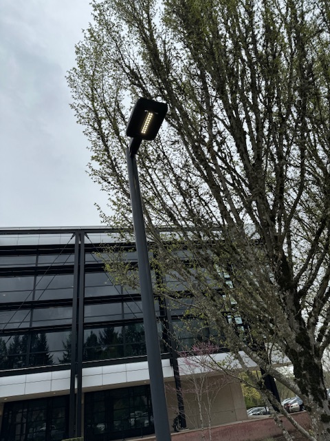 At about 11:20, the eclipse reached 24% in our area, and the parking lot and building lights were re-lit. However, it was a grey and wet day, so we could not see the sun at all. A pin camera might have worked, but there was little light because of the clouds. Also, our eyes adjusted, so it was likely a dark time, but it was just another grey morning in Oregon to us. Again, the only hint was the parking lot and building lights restarting.