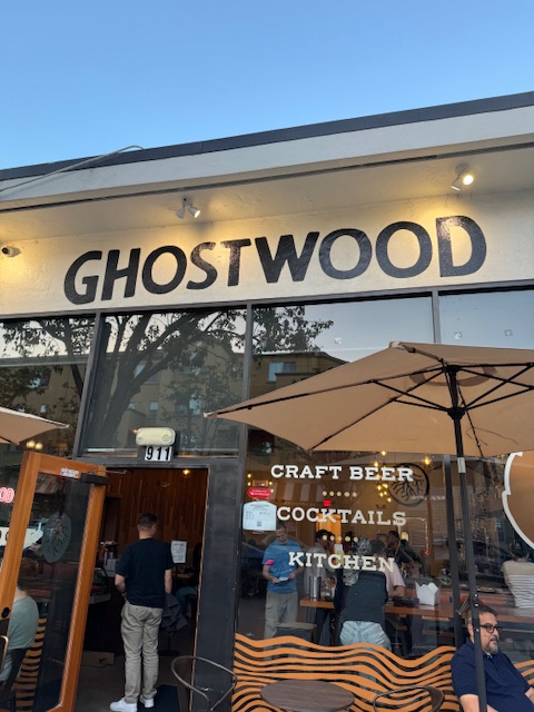 He told us there was a concert at the square in the old town. We all headed out. We moved Air Volvo and found a coin-pay parking spot. Matt V had coins and paid fifty cents to prevent a ticket. It was a few blocks from the party. The local bars and restaurants were busy. The crowd was not overwhelmingly large, but it was well-behaved and enough to fill the streets. We reached the music, and the Reggie band started to play again, and the streets were full of folks sitting in chairs enjoying the evening. We found Ghostwood and got some more drinks, wine for me, and beer for Matt.