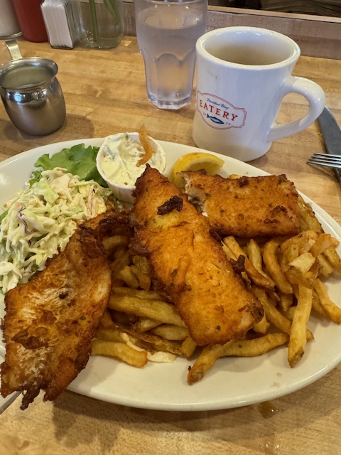 The place was slammed, and it took some time to get our order in and for our food to appear. But we were not in a hurry, and the folks were friendly and helpful. We both had fish and chips as the menu was priced a bit high for more fancy dishes. I tried a cup of the chowder, and while homemade, it was not great but good. My tastes are off from the thrush and treatments, so I don’t count my vote against them. The fish and chips, three pieces, were in a light, perfect batter, with thin fries that were perfectly fried and served with malted vinegar. The little coleslaw on the side was creamy and matched the excellent tartar sauce. An excellent meal. Matt V finished my fries as I am still using steroids. The gal next to me had a slab of local salmon, and she said it was perfect. We also heard some folks from Atlanta praise the cooks. So, our good karma continued with our random choice. Just let the universe pick for us while paying attention to the usual signs and portents (that there was nearly no parking at the place, which was the best karmic influencer for us).