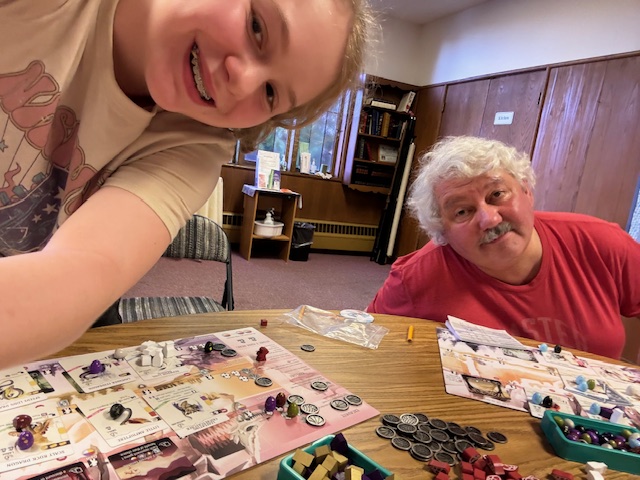 Z and I played our new favorite, Wyrmspan, and pushed our limits, with the last action deciding the winner. Z was one point ahead, putting in a last dragon as her last action and holding one coin for points (literally being the winning point) that sealed the last goal for her. I thought I had her until that last dragon as I had tied her in the last goal until then. Good move, Z! The final score was 75 to 74; that coin (unused coins count as a point each) was the win!