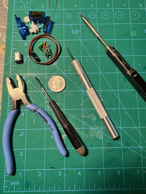 Air Volvo had me back home without much effort. I then returned to my build project. I took a regular 90-degree servo, a tiny 9-gram one, and disassembled it. I then used my newly acquired TS101 Smart Soldering Iron and tried to remove the tiny motor from the small control board. I destroyed the motor when it came out in pieces. I have more. I repeated the processes and managed to be more careful and succeeded in desoldering the motor without damaging it the second time.
