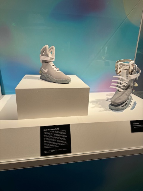 I walked through the other exhibit, Future is Now, which is about sneakers–something I know much about. It reminded me of the Department of Archives for Nike (DNA) and many things I have seen at the shoe company. They had a pair of the famous self-tightening boots made for the anniversary of the movie Back to the Future. Someone had disassembled one boot and made a display of how the shoe was made. My connection to this was the stories from friends who worked for Nike about trying to buy and import motors and the requirements for importing shoes with motors and batteries–no simple task, I learned. I smiled and took a picture.