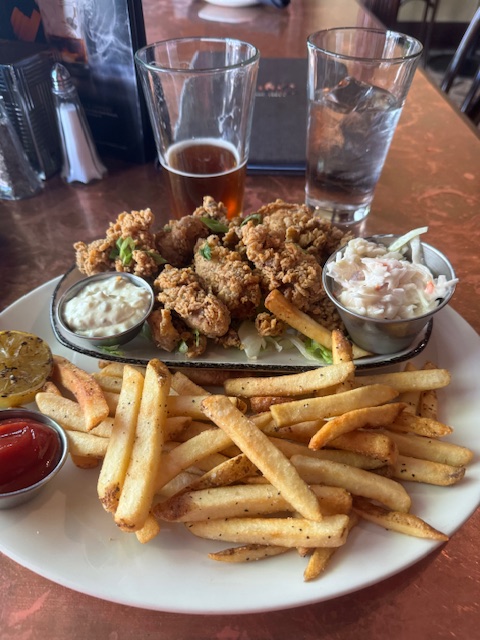 I remember where I was, left Park, and found Jake’s Grill. I have not been here for a while. I get a table with a window in the bar. This means no white tablecloth and no waiter. Instead, I get Tucker, the bartender, and a copper-topped table. Tucker picked a good ale for me, and we agreed that summer is a time for oysters and not the chili blue plate special. The Oysters are $19, which is a bit steep for lunch, but this is Portland, and I am getting used to the higher prices. Like I get in other places, I expect three or four small oysters lightly breaded and fried in a pan. I get well-breaded and deep-fried, like their fish and chips, six huge local oysters. Each is cooked to perfection. The fries are cooked perfectly and called out for vinger (instead, I use ketchup), and the cup of slaw is good and not too much. I am challenged to eat this much food.