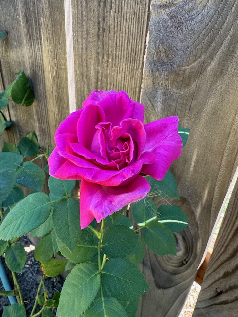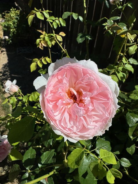 The English rose, Wedgwood, is a climber and as tall as my fence.