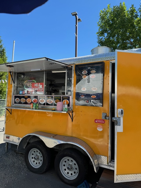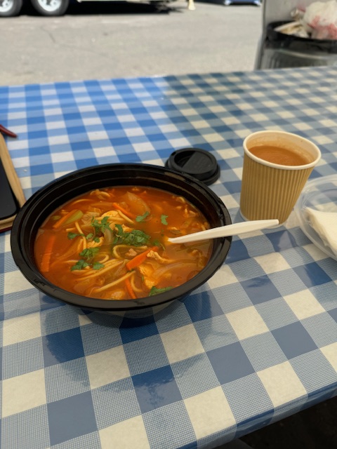 I washed up, shaved, and so on just before noon. I headed to Walgreens to purchase more eyedrops, which is about $21 a bottle (I figure that is 75 cents a drop), with you supplying your phone number and losing your privacy. I then headed to the food carts in the back of the parking lot. My usual place was not open for lunch, so I talked to the gal at Mouthful Momo. I had their noodle soup and hot chai. It was excellent.