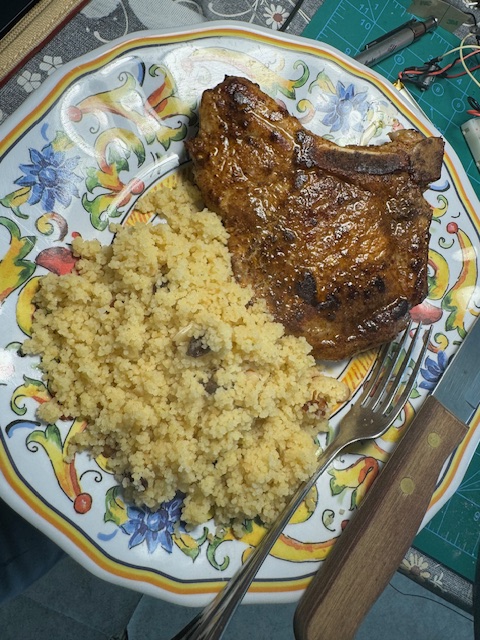 Air Volvo returned me to the house without incident. I rested and read. I rose and started working on my miniature electronic projects again. I am just trying to load the test programs on the hardware. I crash the hardware with a system panic (I have never had this before). I made an early dinner; I was dual-tasking. Dinner was couscous (burning the spices for the first batch and restarting–my multi-tasking was less successful) and a pan-fried pork chop with Morocco-style spices.