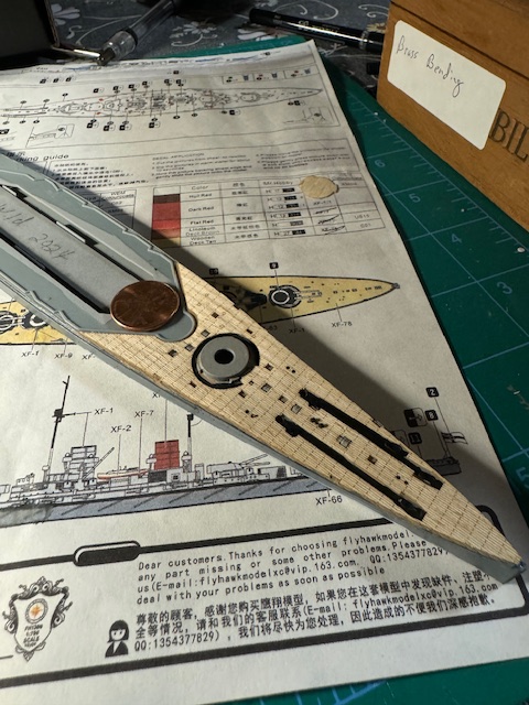 It is hard for me to start a model as I see all the mistakes and to do is to risk. I finally began to paint more of the model, starting and stopping. I have used laser-cut wood overlays for decking for WW1 models. This avoids all the painting and trying to make the deck look like wood and all the lines that need to be perfect but are tiny. The masking to perfect these deck lines is very difficult and time-consuming (and not fun). I got out my best and unused 28mm figure painting brushes from The Army Painter: The Psycho and Kolinsky Masterclass. These are magic brushes that put paint where you want it. I cannot stress how good these are. I managed to paint the tiny deck bits and only paint in millimeters of the surface. When dry, I can correct the mistakes. I use 3X bifocal eye protection and lots of light. I have to hold the model in various positions to get the deck colors on the side of the tiny bits that are the capstones. I paint the anchor plates and the gun markings and over-paint a small amount. I stop there to let the paint dry, and when I make three mistakes, it’s time to stop. While the lines are not perfect, most will be covered by the overlay. I am just ensuring the colors will align (grey under wood is not a good look).