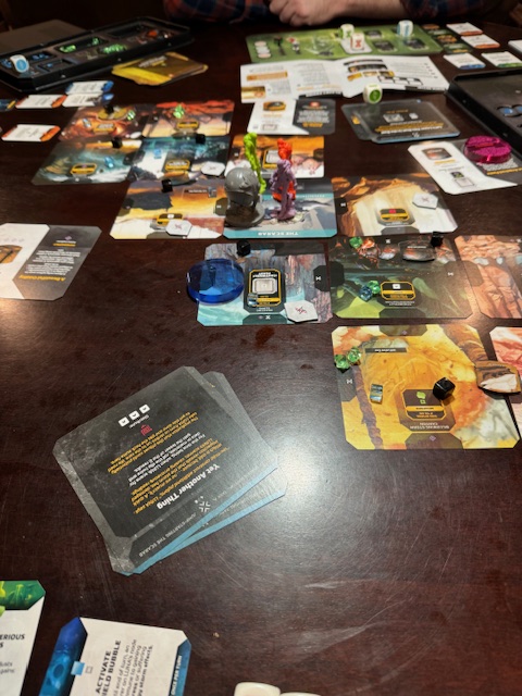 Next, we played Unsettled, a cooperative game designed here in the Greater Portland area. We played the same planet as before, the second one with the initial game: 002 Grakkis. This sci-fi game simulates a group of scientists forced to explore a planet, Grakkis, find resources, and perform tasks to escape the planet without dying. It is cooperative and allows you to play certain science discoveries on your own turn, constantly making the game a debate about who is doing what and not burning down resources too fast. The motto of the game is “Space is dangerous; try not to die!”