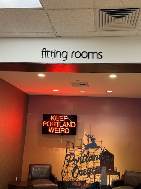 I believe I have taken a photo before, but it is always strange to see Macy’s fitting room with a neon sign reading, “Keep Portland Weird.” I’m never sure what that message is. The rest of the store would match any other Macy’s in the USA, but the dressing room is the only element I find local in the whole mall. It is the same as anywhere else in the USA.