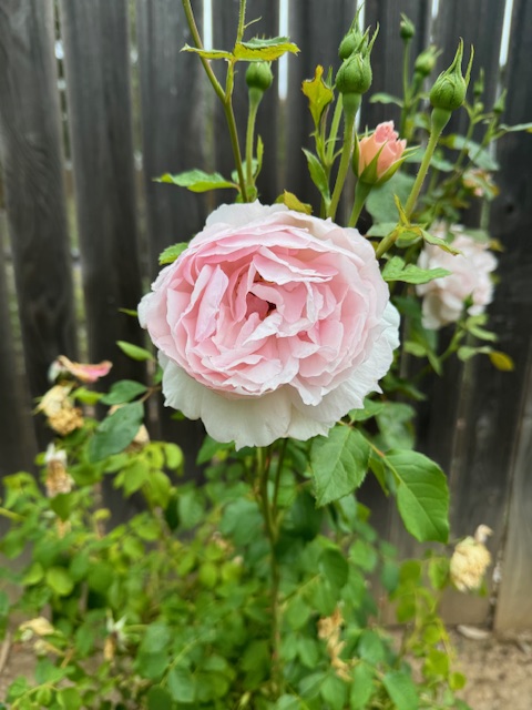 Here is David Austin’s Wedgwood climbing rose. It nearly drowned last winter, but it has finally fully recovered, and the flowers are four inches across!