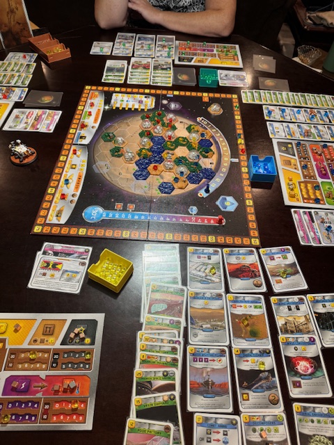 This is a tableau card game with a theme of terraforming the planet Mars for human life. It enables engine building, resource management, and investing. Working placement is not part of the game. It is longish (even the base game), and we take until 11:30 to complete with stops and start to remember a few things and to cover details for Lauren. I play too conservatively, remembering stalling and being bored when I could not do anything for an hour, but I generally enjoy the play. It is mostly about playing your own stuff and being efficient in winning. Richard lands all the milestones (a first for him) and wins by twenty points. I am behind Kathleen by twenty points, but it was an excellent showing, with Lauren almost catching me. I ate pretzels the whole time, something I don’t usually do.