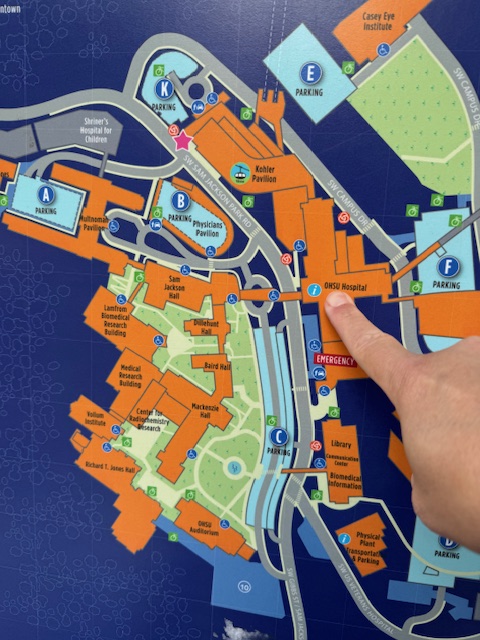 I learned I was a short walk from OHSU hospital and that my parking was correct (really?). I walked out of the Shriner’s area and up the hill, and there was a set of confusing signs, poorly arranged walkways (this is a drive to the hospital setting), and a tiny sign for OHSU. I found the Portland Tram (yes, we have one) that connects OHSU here on the hill with the building on the river. I was tempted to take it. But that was not OHSU on the end of that. I climbed more hills, walked in the street, climbed steps, and found myself in a lobby that showed signs that it might be a hospital. I asked the greeter why, yes, this is OHSU hospital. There being a gift shop should have convinced me.