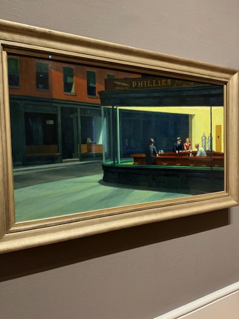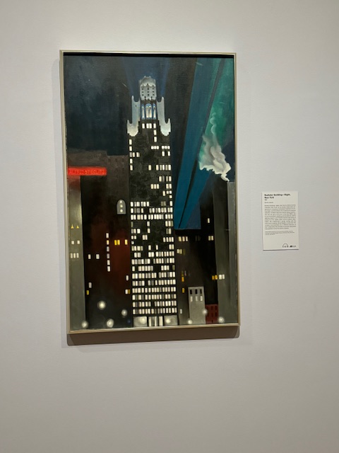 I head back to the maze and soon find the American works again—rooms and rooms of great works. Night Hawks and American Gothic attract crowds. I liked a Whistler painting I have only seen in books: a misty harbor. My back is better after lunch, but I know the pain will return. I head to the O’Keeffe show as I am in the right location. This does not disappoint. I did not realize she had done paintings in NYC before the more well-known Southwest-themed work and that the lines in the more famous paintings can be traced to her paintings of NYC buildings. I also did not know that Batman Animation was hinting back at her works for the view of Gotham.
