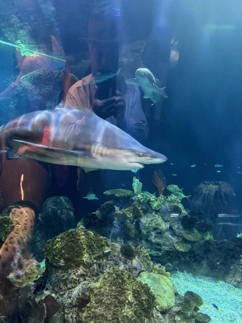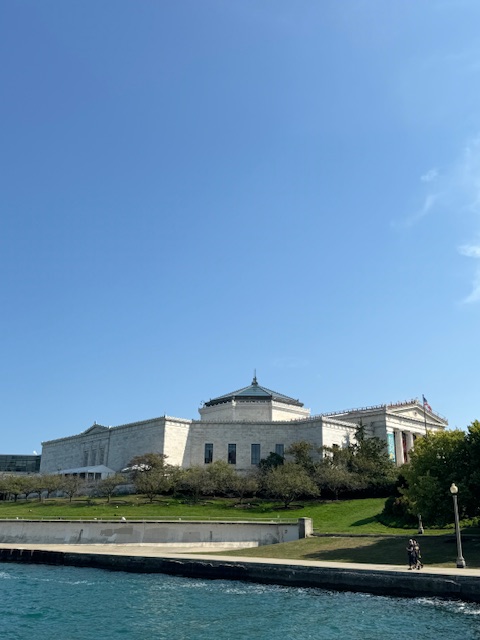 Moving back further, the Shedd Aquarium was Wednesday’s tourism target. I walk to it—a thirty-minute walk—and head to the lakeshore, trying to remember the matching hymn. I go slow and learn not to walk on the bike trail but to use the pedestrian trail by the water. While walking, I spotted the water taxi company I used yesterday’s dock. I climb many steps, discover the aquarium is buried in construction, and have to walk around it. The sun is hot today in Chicago, and the lake’s humidity does not improve the experience. The line is long for ad hoc tickets, but there is a QR code to scan. I buy a ticket on my phone before the line moves a lot. I wait on a bench for five minutes, and the ticket pops into my email. I enter and find the dolphin show about to start. I sit high up with my back of the rock–not comfy but still better, and another gal joins me. She is taking a bus tour from Boston and, like me, traveling alone. She, too, travels often and visits museums all over. I will have to check on bus tours–I like that idea for the more compressed East Coast. We chat about our travels while we wait for the show to start. It is the usual seaworld stuff, and I don’t bother with the camera.
