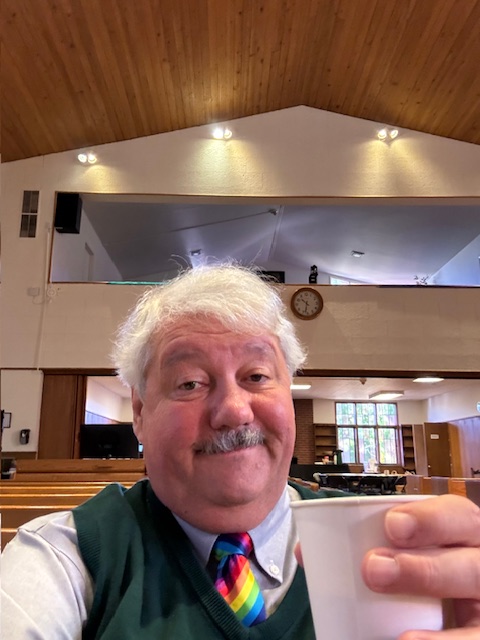 I wore a green sweater vest over a greyish dress shirt with a pride tie, my usual cotton blue pants, and black leather shoes. I sport a pronoun pin now: He/Him. A suit seemed too much for today, and I included my brown soft wool hat (very Indiana Jones). I had three pages of notes to read in 16 Arial font, which I found easiest to read while speaking. I had printed copies of the questions from the UM Oregon/Idaho Conference website (12-13 copies into my notes) and pictures of the slides, just in case I had to read them.