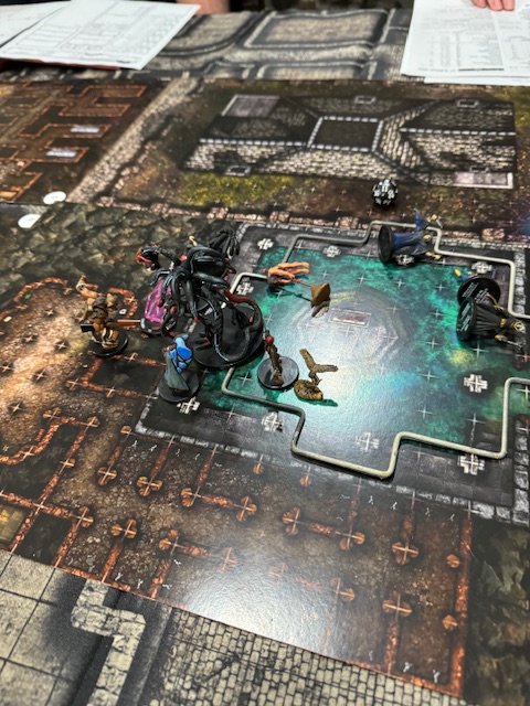 We return to our places before. We are in a premade material about the evil Venca once again trying to take control of the multi-verse and twist it to his dark, undead will. We are here to prevent that. Returning to the game, we fight a giant undead at the start of the play, and Matt does not disappoint with his vast supply of figures, color maps, and 3-D terrain. D&D has its own version of horror known as the dread realms, and we are stuck in what is, effect, a black-and-white Dracula movie. We endure various set pieces and traps with entertaining solutions (entertaining our vampire host). I am holding back the same spell I used last time. Our host, played by Matt, getting to rework a famous 007 villain line, when asked if we could do a service for you instead of fighting, says, in an accent and with a fancy shirt on, “I expect you to die, as my service.” The vampire finally gets into a battle with us and starts, as a single target, to be injured and uses up his superpowers, and then I use the spell, which is based on current hit points that make him, even in bat form, easy to take. We defeat our host (we did not destroy him as that requires a quest) and escape the dread realms.