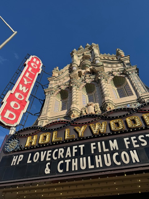 When I see him, Cody Goodman, dressed in a priestly vestment, salutes back to my raised beer. Only fifteen minutes late, a new record for quickness for the festival, Cody walks on stage with a gal dressed in a tight costume, reminding us of Cthuhu (known as Cthulhu girl), and leads us in the main theater in chants to open the film festival. Gwen and Brian, who run the show and the Kickstarter, come on stage to provide opening remarks and some instructions. Friends from the early game sit next to me. Folks from last year sat behind me, and we chatted before the start. One of the filmmakers sits in front of me. For me, the H.P. Lovecraft Film Festival reconnects me with fellow cultists I see about once a year and some new ones.