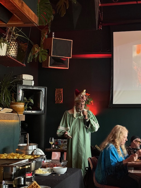 Cody Goodman leads that program and even gives a sermon. There is singing of hymns to various Lovecraftian gods which ring close to Methodist hymns such that I manage to sing strongly and boldly (remembering John Wesley’s instructions) to the surprise of my table mates; churchgoers are not usually present at this prayer breakfast and would indeed object to the new words. I know the melodies! My fellow cultists expect me to be excommunicated, but I point out that I am on that committee, being a wise cultist, and that was unlikely. That did get some raised eyebrows as the internal workings of a Christian church are foreign to these folks and seem as arcane as any of the texts they purport to study. Breakfast was excellent, and the singing was terrible, as usual.