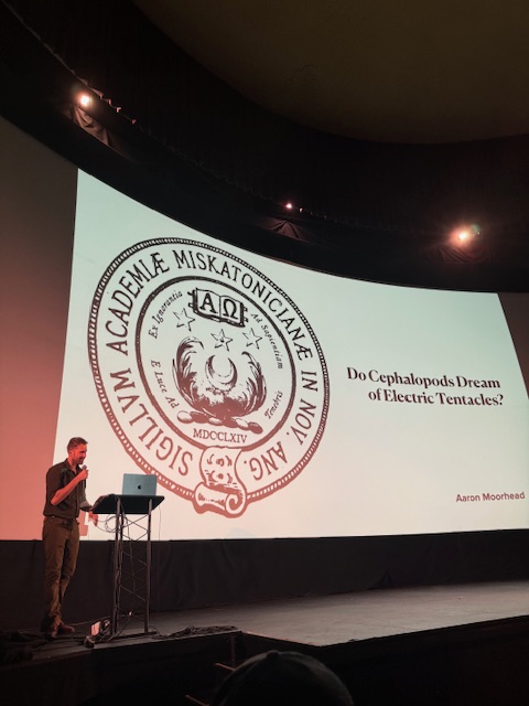Tired and late for the start of the festival, I find my usual seat is taken, and instead, I pick row two and one chair over to the left. I stay through the keynote and the first block of shorts. A film creator, Aaron Horehead, for some well-known (though I don’t like them) films, gave a presentation about octopuses and how we seem to use tentacles and octopuses to represent alien intelligence. He includes tentacle-based shorts from his movies in the presentation and points out that his films were called Lovecraftian before he knew what that meant. While entertaining, I did not learn much more other than not to eat octopuses as they are intelligent.