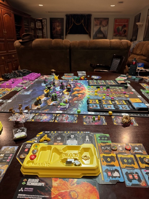 Chris joined us, and we played a three-person game. This is a reimplementation (with improvements) of the older and loved Everdale board game to a SciFi setting. Well-loved by some, I am not a fan, and this older game is in my “yes, I will play it if you bring it” category of board games. This reskinning to SciFi and rebalancing and rule fixing has produced an excellent new game. Richard’s copy was the all-in Kickstarter version and now sells for about $250, maybe with shipping, and has lovely plastic and wooden bits. The game was surprisingly efficient, and I found that my turn was easy to plan and understand what was happening. Richard slammed into Chris and me, and I soon lost every battle, but I had a pile of cards that had me retrieve my ships and suddenly recover and add more capabilities in the first turn, returning me to full power and better. Richard continued to attack and slam into us; he was unstoppable. But I still liked it and certainly enjoyed it better than Everdale. When preparing to play, I had read that Everdale owners were now only playing Andromeda’s Edge. Our game played fast and was done in two hours, even with me requesting clarification and help occasionally. Expecting to score at the bottom, I matched Chris’s score, 104, and we were both amazed by Richard’s 180+ score. A good showing for me in a first-time play.