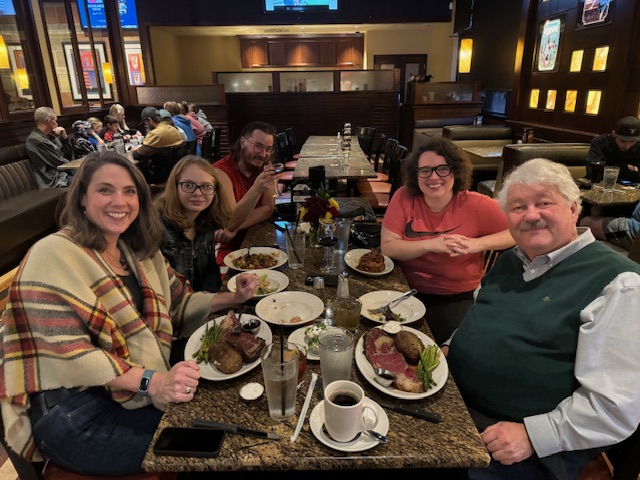 I ordered some appetizers. And Orange marmalade calamari was soon before us. Z’s first encounter with this food with tentacles. Later, I ordered pot stickers, fried, not grilled, followed (both suggestions from Mo and heartily endorsed by Courtney). Z found Jambalaya on the menu and decided to try that–most of it disappeared inside Z. Dondrea and I both went with the Midwest-style prime rib, giant slices, baked potato and asparagus, and a salad. Mariah and Corwin (who was late, and Courtney accepted the role of shaming him for being late with a smile) both went with the double pork chop. We told a few funny stories about Susie and kept the dinner happy and lively. The booze helped (Z was full of sugar), and Courtney was perfect. Dessert, coming with most meals, was shared.