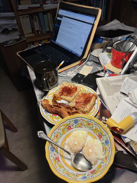 I thought it reasonable to use the bacon I cooked before and in the frig and made poached eggs and toast to go with the bacon that was zapped in the microwave for two thirty-second hits. I put salt and vinegar in the water I heated. While it looked like egg drop soup, I got the eggs out with running intact yokes. After cooking, I returned to the blog and spent the morning writing, texting, reading emails, and news (some political, with Harris and Trump reportedly in a dead heat in the purple states). I was relieved that voting had started in Georgia and that there had been no violence. Judges are ruling against various last-minute and non-sensical voting rule changes there. For my health, I have turned away from reading war news and will focus on cooking more.