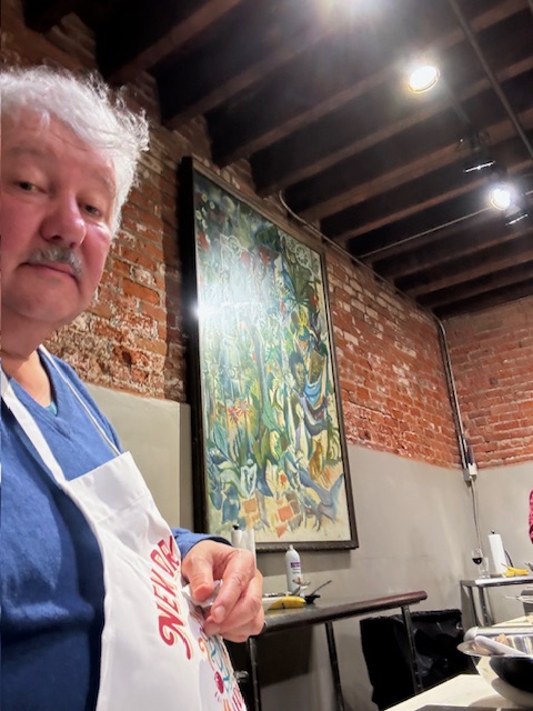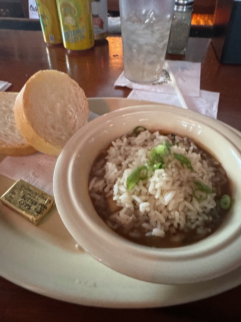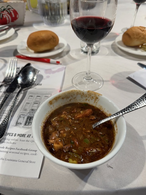 There were a few f**k-ups, and as I said, Jambalaya (my reason for booking on Thursday) was dropped for gumbo. I have a cooking surface for myself (explaining the high price), and most share three on a surface. We used induction surfaces, and the surface stops working if you lift a pan or move one off the burner. I managed to crash mine three times due to Maria’s frustration (not so much with me, as this just throws off her game as she has to help me often–their surfaces are not the best for a cooking class, and others are also challenged). I also grab the wrong spices and end up with a more Italian-styled gumbo, which, to our surprise, is quite good. I tried someone else’s version and could barely taste it after the burning hot spices. They liked it. I am feeling quite stressed and not enjoying this, but I am tired. We eat the food we cook, and I feel better. I have a second bowl. Still good. The wine helps (as I am not driving, I have three glasses).