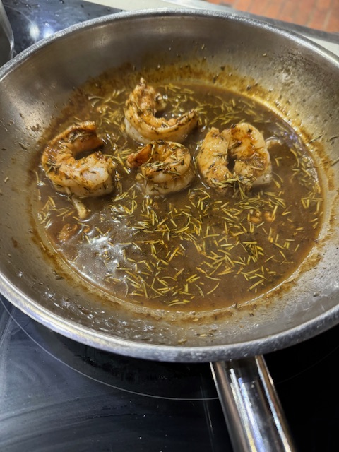 Maria is visibly stressed as the f**k ups, not us, but the setup and menu was changed. We cook shrimp and de-head, peel, and devein our shrimp. We cook the heads in butter and squish them to exact the shrimpy goodness. Heads, peels, and so on are discarded. I add seasoning and cook the shrimp. Grits were started before, and now we add butter and cheese; don’t stir much (Maria warns us that stirring grits makes them glue).
