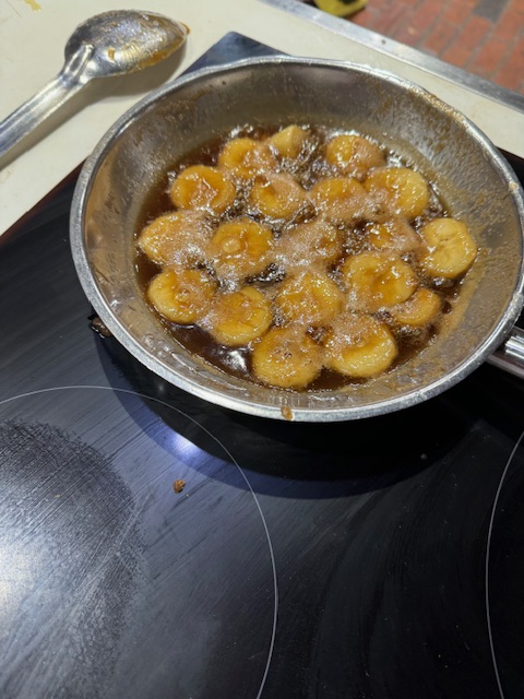 Banana Foster is next. I am getting my cooking mojo back and enjoying this, and Maria helps others more. My surface crashed without help this time, and Maria got it back online, and we lit off my dessert. I enjoyed it at the table with the crepes I made (I have the pan for this and will have to make them again).