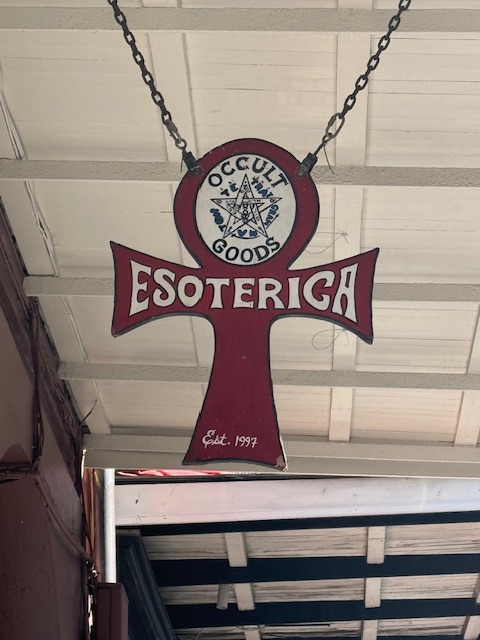 Next door is the One Esterica Witch Occult Store. I read on the sign, “Come in and enjoy the Peace and Quiet,” and decided to try it. Its supplies, books, idols, and many others related to darker powers were for sale. For example, one of Alister Crowley’s books was for sale. This was an occult store, not a voodoo tourist shop. One wall was a pharmacy-like wall of herbs and plant bits, some dangerous, available for purchase by weight. The shopkeeper told me that the mandrake was the safer and lesser version; though she has handled the hazardous kind, she would only supply that to experts. Interesting. I said the sign brought me in, and then we were shocked to see that the sign did not say what I saw. The shopkeeper was concerned that someone had changed her sign, checked it, and pointed out that it did not say what I had seen. We all smiled at that. Yes, a spell. Hmmm. After the jazz, I would buy a card and a small book, ignoring Crowley, which I can get cheaper used at Powell’s if I wanted it (I don’t).