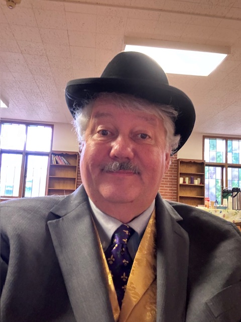 I put on the New Orleans tie (see picture) I purchased in the French Quarter on the last trip for too much money. It is silk and reportedly from Italy (though I imagine that the only thing from Italy is the spelling of Italy). I put on my golden vest (now a bit large) and added the cheap but good-looking pocket watch and chain.