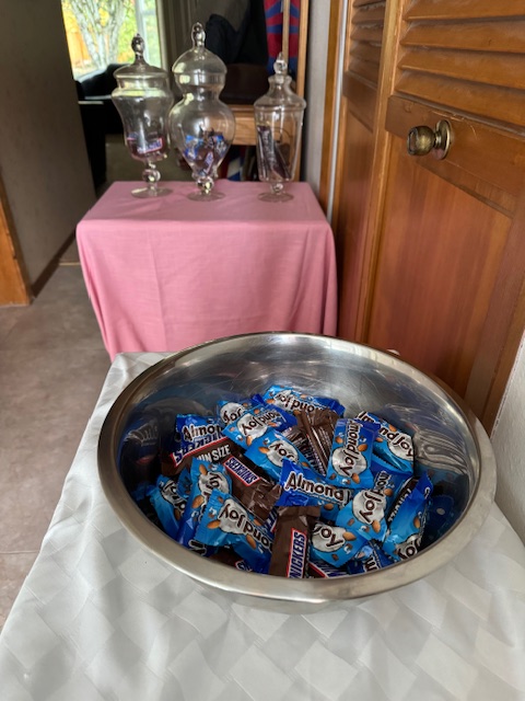 With all my goodies, I headed home. I put them away and got out some limited Halloween decorations. I found my yelling skeleton, a projector of a haunted house, and some blinking lights that I have lost for years and found in my office boxes. The few, about four groups, in various looks, primarily bright. My skeleton, a plastic foot-tall guy calling out for help from his cage, fascinated the younger kids. Older kids and former kids were focused on handfuls of Snickers and Almond Joy, all ‘fun’-sized and not the yelling skeleton. I called for the older folks holding back to come forward and grab some of the bounty offered. I already had five! I wanted none to remain.