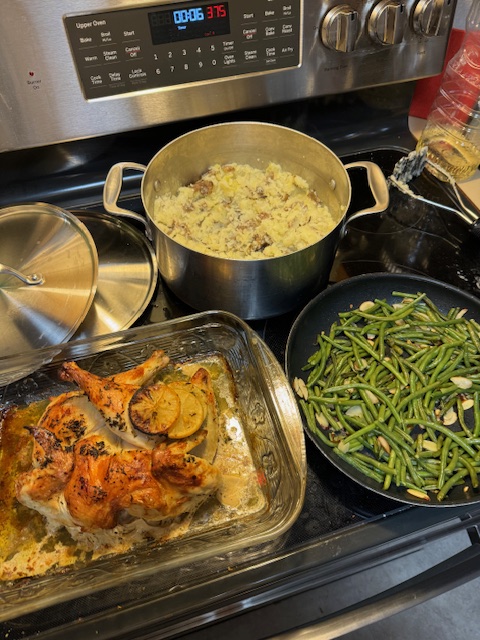 I cook spatchcocked chicken with lemon and seasoning from Trader Joe’s, which you just bake for about an hour. I make mashed potatoes with the skins on, and wilt steamed green beans (frozen and from Trader Joe’s) in butter, fresh garlic, salt, and almond slices in a frying pan. It is good, and there are leftovers. I split the leftovers with Corwin. Corwin did the dishes and then headed out. He walked home, hoping soon to have insurance.