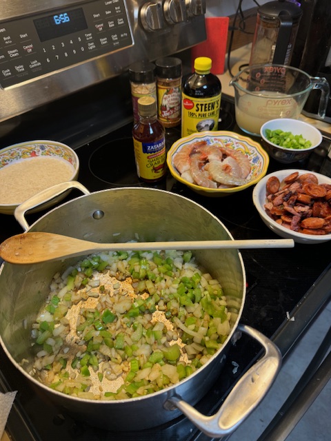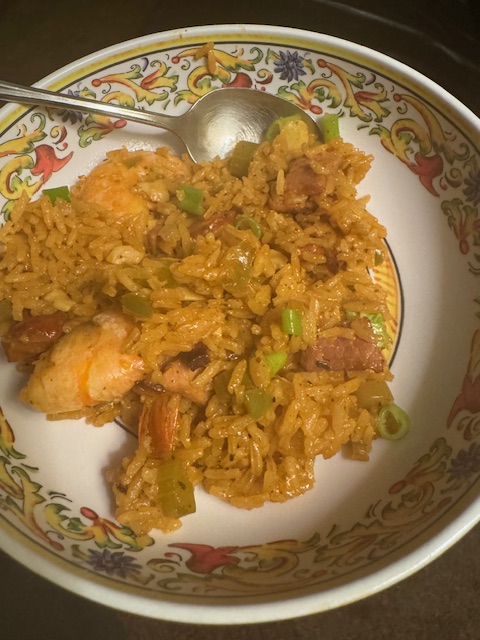 I was unhappy with the flavor or texture, but it strongly hints at NOLA’s versions I had while there. The smokey ham I added and cooked to almost burned was excellent (more bacon than ham). I would go for a brown version with no seafood next time with some tomatoes. I would add a second set of trinity to cook with the rice to add to the texture, one of Chef Reneé changes.